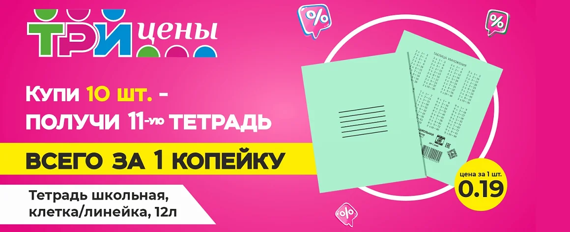 Купите любые 10 тетрадей – 5 в клетку и 5 в линейку (или в любом другом сочетании), и получите еще одну тетрадь в подарок всего за 1 копейку.