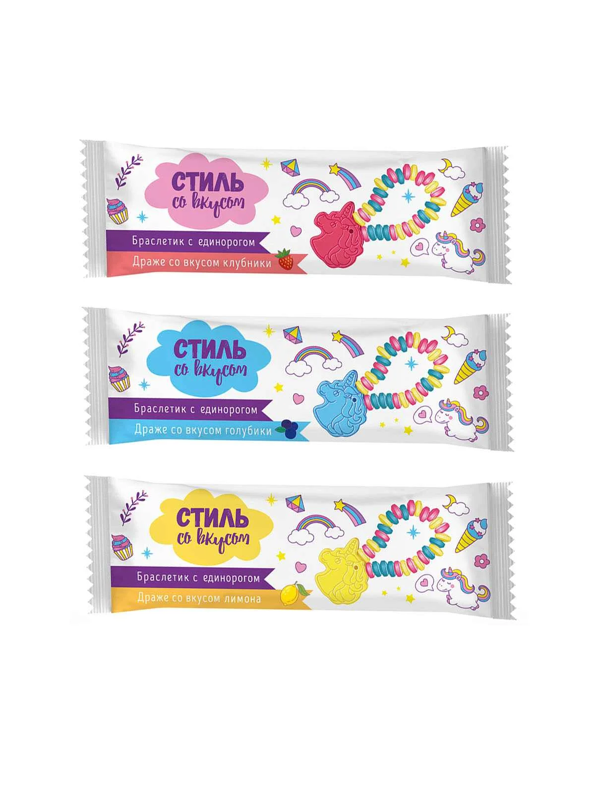 Драже (СТИЛЬ СО ВКУСОМ Браслетик с единорогом) со вкусом клубники, голубики, лимона 15г