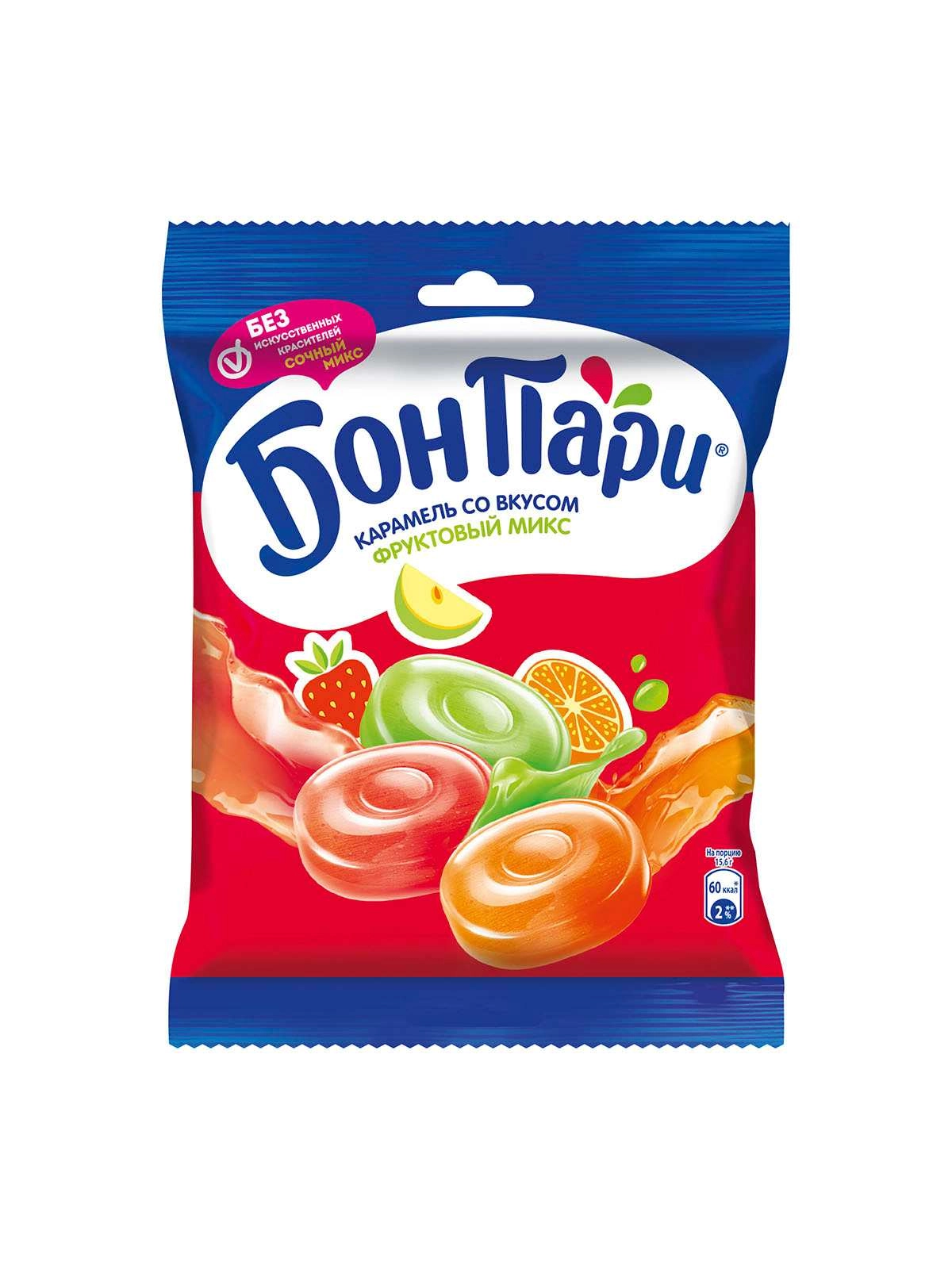 Карамель Бон Пари® с фруктовыми вкусами от популярного бренда, известного с 1977 года.  Леденцы Бон Пари® для тех, в ком жив «внутренний ребенок»: в каждой пачке ассорти яркой карамели с фруктовыми и
