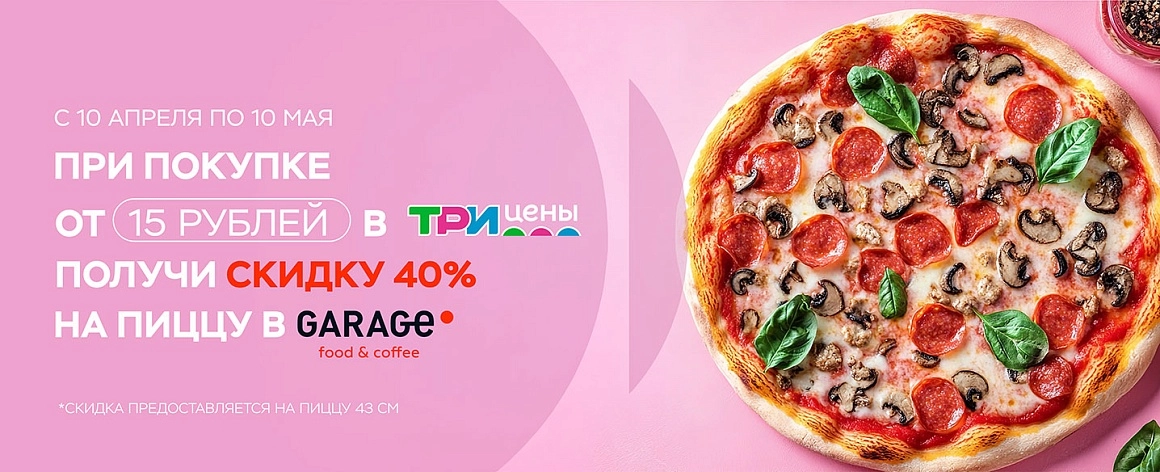 С 10 апреля по 10 мая в сети магазинов «Три цены» проходит совместная акция с кафе GARAGE. При покупке от 15 рублей выдается дополнительный чек со скидкой -40% на пиццу 43 см в кафе GARAGE (в зале или навынос). Для применения купона необходимо назвать промокод сотруднику кафе или указать его в мобильном приложении garage.by.